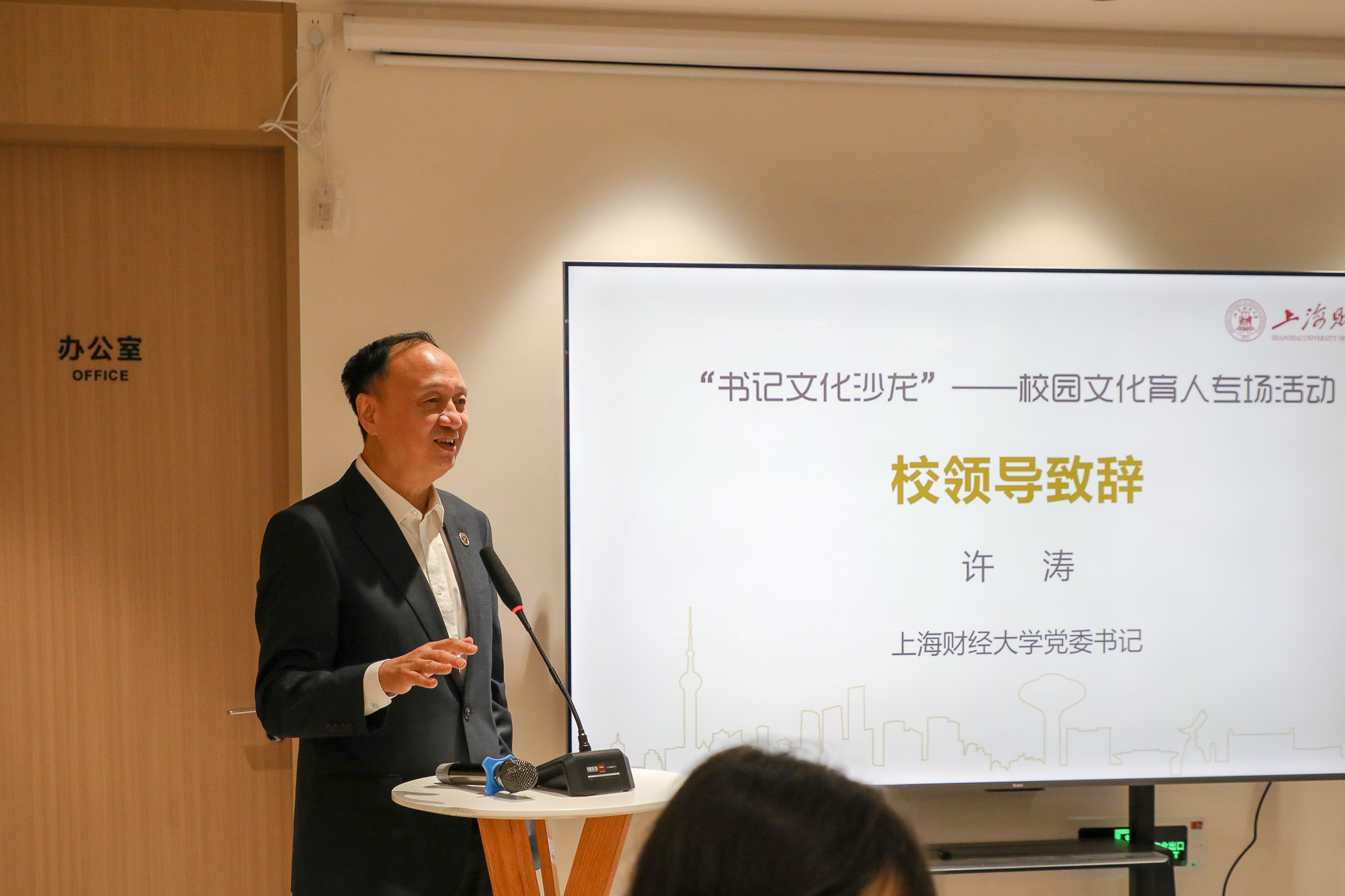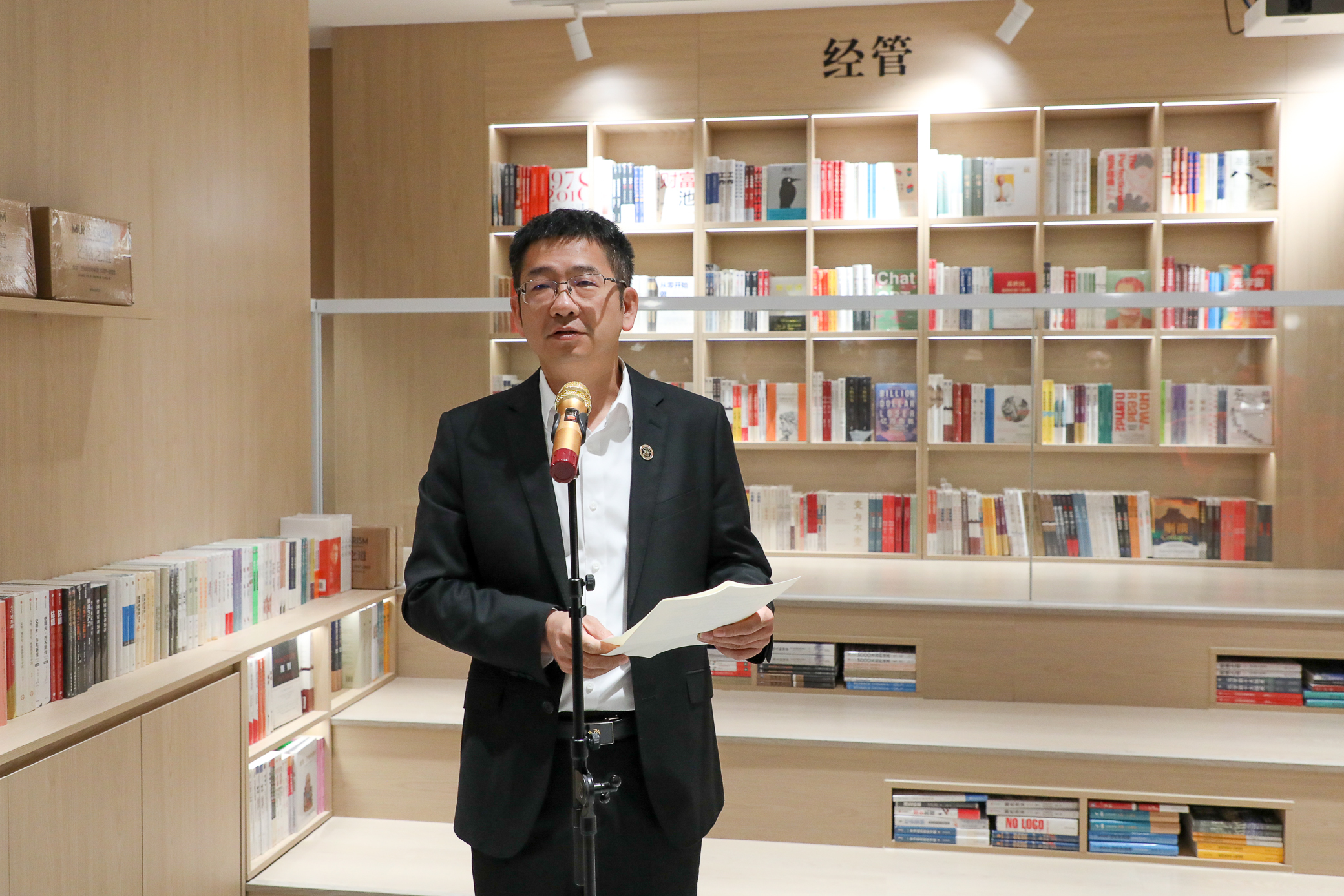 许涛书记在致辞中向活动嘉宾表示欢迎,向积极参与书店建设的师生表示感谢。他谈到,多年来,上海财经大学始终致力于打造“书香校园”品牌,充分运用各类载体,多措并举,开展多种形式的读书活动,宣传倡导广大师生加强阅读,形成了浓郁的书香校园氛围。匡时书店的落成融上财精神、传匡时文化,既是提升师生阅读素养的重要举措、优化校园书香环境的点睛之笔,更是扎实深入贯彻习近平文化思想和全国教育大会精神、响应上海市委关于建设习近平文化思想最佳实践地部署要求的实际行动。