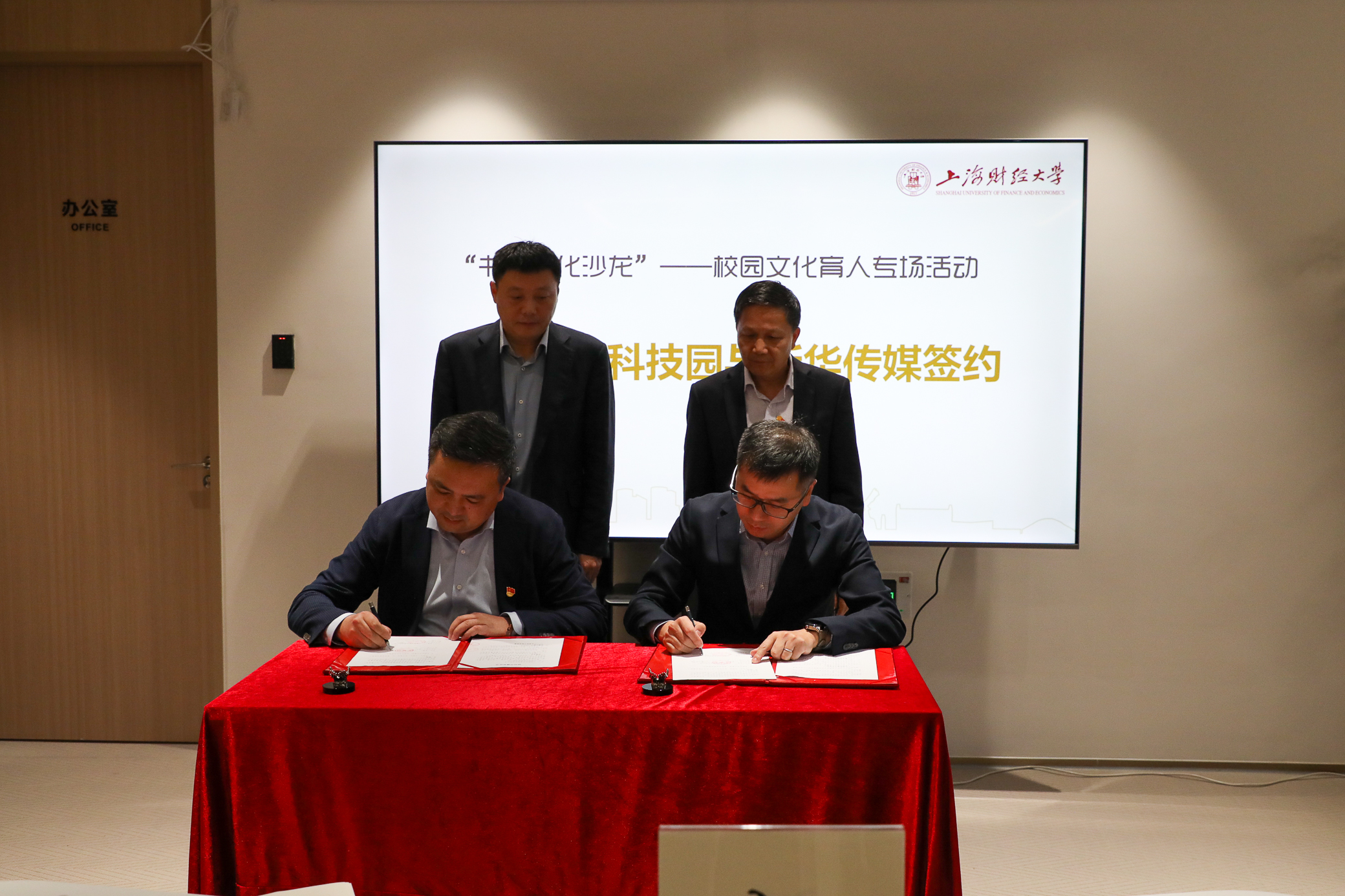为进一步探索科技与文化的融合之路,在更多领域、更深层次展开合作,新华传媒副总裁李鹏程、财大科技园总经理邓效在新华传媒总裁刘航、财大科技园董事长陈信元的见证下,签订《结对共建协议书》。