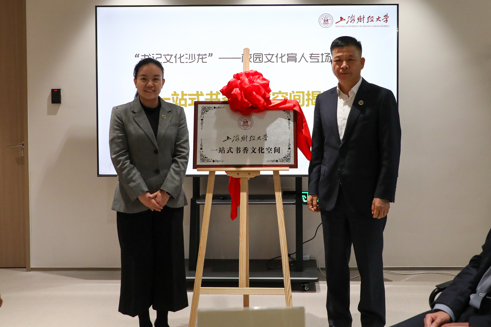 秦健聪校董与校党委学生工作部/研究生工作部部长、团委书记沈亦骏一起为“‘一站式’书香文化空间”揭牌,依托匡时书店打造富有上财特色的“一站式”学生社区。